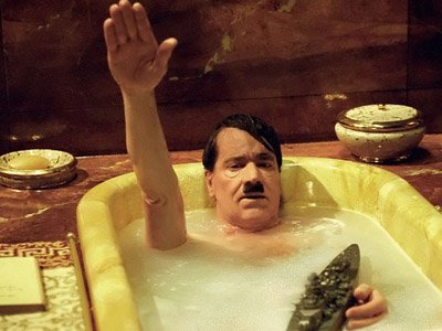 A kereskedelmi tévék nem nagyon tudnak minderre reagálni, néhány sokszor látott nyári szirszarral nyilván lazán hozzák majd a betervezett nézettséget, ergo, sehol semmi érdekes. Kivétel talán a tv2 késő esti (23.40) filmje, amely A véresen valódi valóságot meséli el Adolf Hitlerről. Ez a cím, illetve ez az adó már önmagában jelzi, hogy természetesen mindenről lesz itt szó, csak a hiteles valóság- és történelemábrázolásról nem, így marad, hogy baromságot ajánlok. DE. Az mindig érdekes, ahogyan a németek nyúlnak saját múltjuk kínzó kérdéseihez, még akkor is, ha a filmet zsidó származású rendező készítette. Ezúttal azonban nem drámai megközelítésben találkozhatunk Hitlerrel, hanem frivol, gúnyos, sőt olykor kifejezetten cinkes hangnemben nézhetünk meg egy nyilvánvalóan megosztó, fiktív történetet a múlt század egyik bajuszkirályáról. (Kép a filmből)