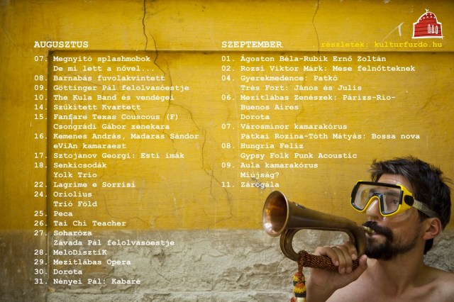 Idén nyáron augusztus 7. és szeptember 11. között, immáron negyedik alkalommal jelentkezik Budapesten a Kultúrfürdő nevű programsorozat a Halastó Kulturális Egyesület szervezésében. A kulturális estek elvarázsolt, egyedi, titkos helyszíneken zajlanak a Víziváros és Felhévíz környékén.