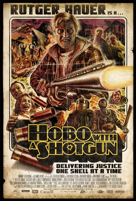Sok szót nem érdemes vesztegetni erre a Tarantinóék által feltámasztott grindhouse-hullámot meglovagolni szándékozó agyatlan hentelésre, melyet bizonyos Jason Eisener számlájára írhatunk, hiszen gyakorlatilag nincs is benne semmi említésre méltó. A Hobo With Shotgun (kapott valami irtó béna magyar címet is, de azt most hanyagolnám is…) tényleg nem más, mint