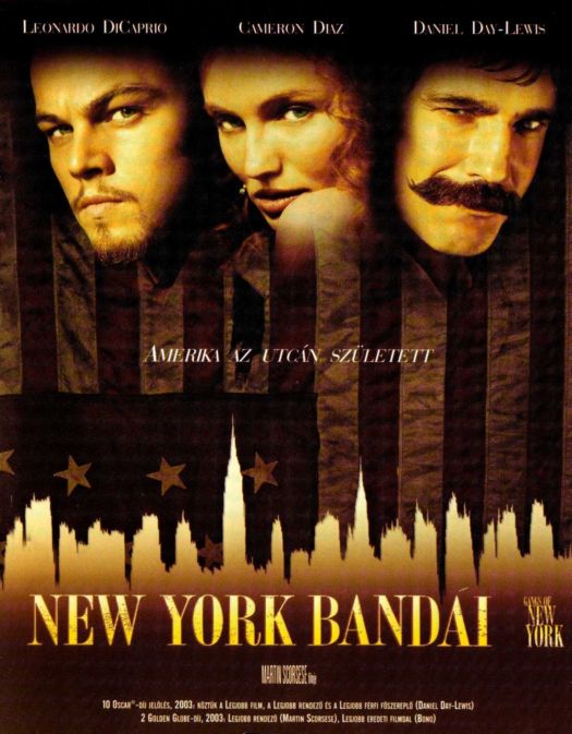 Viszont Scorsese nagyon tud atmoszférát teremteni, annyi szent. Ezúttal némi humort is felfedezni vélek, ami nem nagyon jellemző a busa szemöldökű mesterre. Méghozzá valami fura groteszk-félét, kicsit Brecht Koldusoperája jut eszembe, kicsit anakronisztikusan Bosch és Brughel képei, illetve a reneszánsz commedia dell’arte világa, márcsak ezért sem jön le nekem a történelmi tabló, miközben nyilvánvalóan ennek festése Scorsese szándéka. Amúgy ez illeszkedik is szervesen életművébe, melyet a kezdetektől átsző New York lényegének keresése, vagy megfogalmazásának igénye. A nevek, a bandák elnevezései, bizonyos akciójelenetek szinte nevetségesen bumfordiak, igen éles kontrasztot képezve a vérben tocsogó, explicit erőszakkal, ami a film másik fő vonulatát képezi. Éktelenül, szinte már csiricsárén színes a film, ezt csak úgy mondom, ehhez a filmhez végül is, éppen így illik.