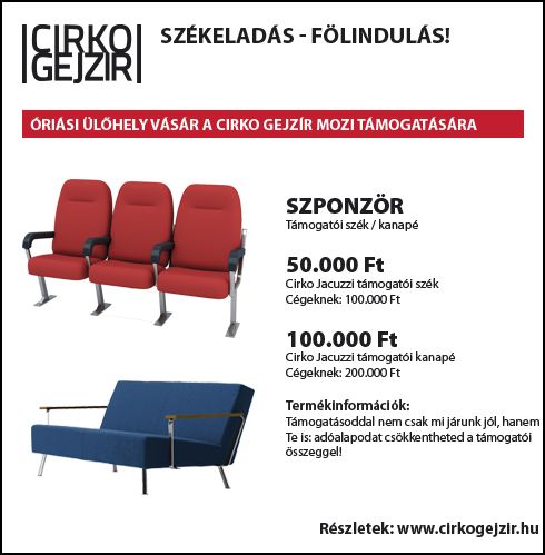 A Cirko-Gejzír mozi székeit és kanapéit „megvételre” ajánljuk azoknak a filmbarátoknak, akik támogatni szeretnék tevékenységünket, és ezzel segíteni a mozit fenntartó alapítvány működését.