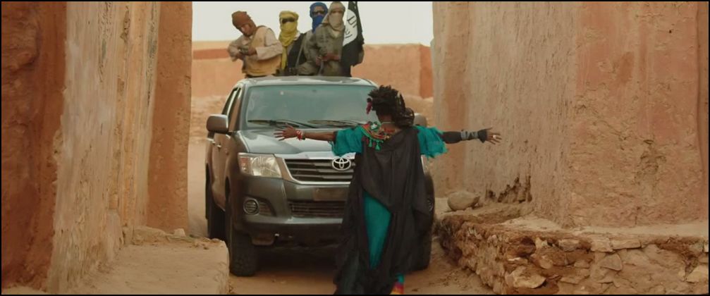 timbuktu 2A címadó híres város Mali északnyugati részén fekszik, néhány kilométerre a Niger folyótól, mégis a Szahara szívében. Timbuktu Afrika egyik arca, ősidők óta lakott település, a Világörökség része, elsősorban a világ legnagyobb sárból tapasztott temploma, a Djinguereber mecset okán, de központja a világhírű mali zenének, a “mali bluesnak” is, valamint a környéken él az a dogon törzs is, melyek azokat a híres, különös szépségű maszkokat csinálják, melyek mintha egy másik univerzum lényeit idéznék meg delejes erővel. Egyszóval, az egész világ szellemi hagyatékának egyik fontos területén járunk – ahol a kezdőképekben épp az elébb említett maszkokon gyakorol valaki célba lövést. Tetőtől talpig lepedőkbe, sálakba és kendőkbe burkolózó, Kalasnyikovokat lóbáló, sötéten villanó tekintetű férfiak, a dzsipjükön a híradókból jól ismert fekete, arab feliratos zászló. Utánanéztem, onnan tudom, hogy az Ansar Dine nevű szervezet katonái ezek, akik magukat a “hit védelmezőinek”, vagy az “iszlám vallás segítőinek” nevezik magukat, valójában ugyanazok a militáns vakhitű, nemzetközi brigád, mint a többi efféle. Sissako finoman, de tévedhetetlen pontossággal jellemzi őket azzal, hogy néha egymás között is többszörös tolmácsolással beszélnek, annyira szedett-vedett, soknemzetiségű és még több nyelvű bagázs. Viszont dzsihádot, vagyis vallási szabadságharcot folytatnak, minek köszönhetően -a helyi vallási elöljáró minden tiltakozása ellenére- Timbuktuban betiltották a dalt, a táncot és a zenét, a dohányzást, sőt, a focit (a focit!) is, a nőket pedig nemcsak a teljes csador, hanem kesztyű és zokni viselésére is kötelezték. Szerintük Allahnak így tetszik, a nép, a timbuktuiak szerint viszont ez hülyeség – a milícia azonban a saríára, vagyis az iszlám törvényekre való hivatkozással minden kihágást megtorol, egyre brutálisabb erővel.