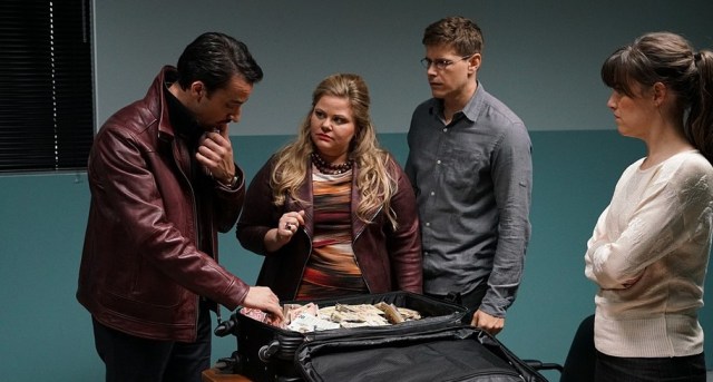 Igen koppanós már a film felütése is, melyben Pierre-Paul, a későbbi főszereplő filozófus-futár fiú (Alexandre Landry) szakít a barátnőjével: erősen sarkítva, a facebookos mémek bombasztikus szóhasználatával, de mégis pontosan jellemzi korunkat, melyben az intelligenciának logikusan csak a boldogtalanság, a sikertelenség és a magány juthat osztályrészül. Szakít a csajával, mondom. Az idiótáknak és kreténeknek áll a világ jelenleg. Sajnos, tényleg úgy néz ki. Aztán, éppen ebben a jók, az értelmesek számára sorszerűen szerencsétlen világban hősünk, küldemény kézbesítése kán, egy rablás kellős közepébe csöppen, melynek végén két óriási, pénzzel tömött táskával lett gazdagabb… 2010-ben valóban történet egy butikrablás Montrealban, Arcand ebből indult ki – és igen messzire jutott. Szerencsére, maga a szajréfilm önmagában is megáll a lábán. Kellően fordulatos, izgalmas a hajsza, ahogyan a fiút egyszerre üldözi a rendőrség és a maffia, akinek a pénzét nyúlja le, vicces, ahogyan a legcinkesebb helyzetekre is talál adekvát filozófiai magyarázatokat. A romantikus szál amilyen irreálisnak tűnik leírva, olyan természetesen alakul a filmben, Camille, a Maripier Morin által alakított lány szemében pontosan látszik, hogyan bűvöli el a cinikus, anyagelvű lányt a fiú romantikus naivitása és rendíthetetlen jó szándéka. A párost jól egészítik ki a mellékfigurák, a cselekmény pedig szórakoztatóan halad a várható, de mégis meglepő végkifejlet felé, ahogyan egy normális szajré-komédiában annak lennie kell. Azonban Arcand Pierre-Paul hajléktalanok sorsa iránt való elköteleződésén, valamint a váratlanul ölébe hulló milliók okos befektetése keresztül sikeresen hangolja a történetet egy olyan irányba, amit ha mindenki követne, talán elkerülhető lenne a címbeli katasztrófa. Mivel azonban ez egyelőre nyilván csak álom, elégedjünk meg azzal a pikírt, kíméletlen gúnyrajzzal, ami Pierre-Paul és Camille szerelme körül kirajzolódik a nyugati világ álszent, képmutató, önző és pénzéhes arcáról, mely érezhetően nem akarja tudomásul venni helyzetének tarthatatlanságát, és amin csak a társadalom minden tagjára kiható és egymás iránt érvényes felelősség felvállalása, gondolataik, cselekedeteik és pénzük (pénzügyi befektetéseik) jó, gondoskodó irányba fordítása változtathat. 10/10